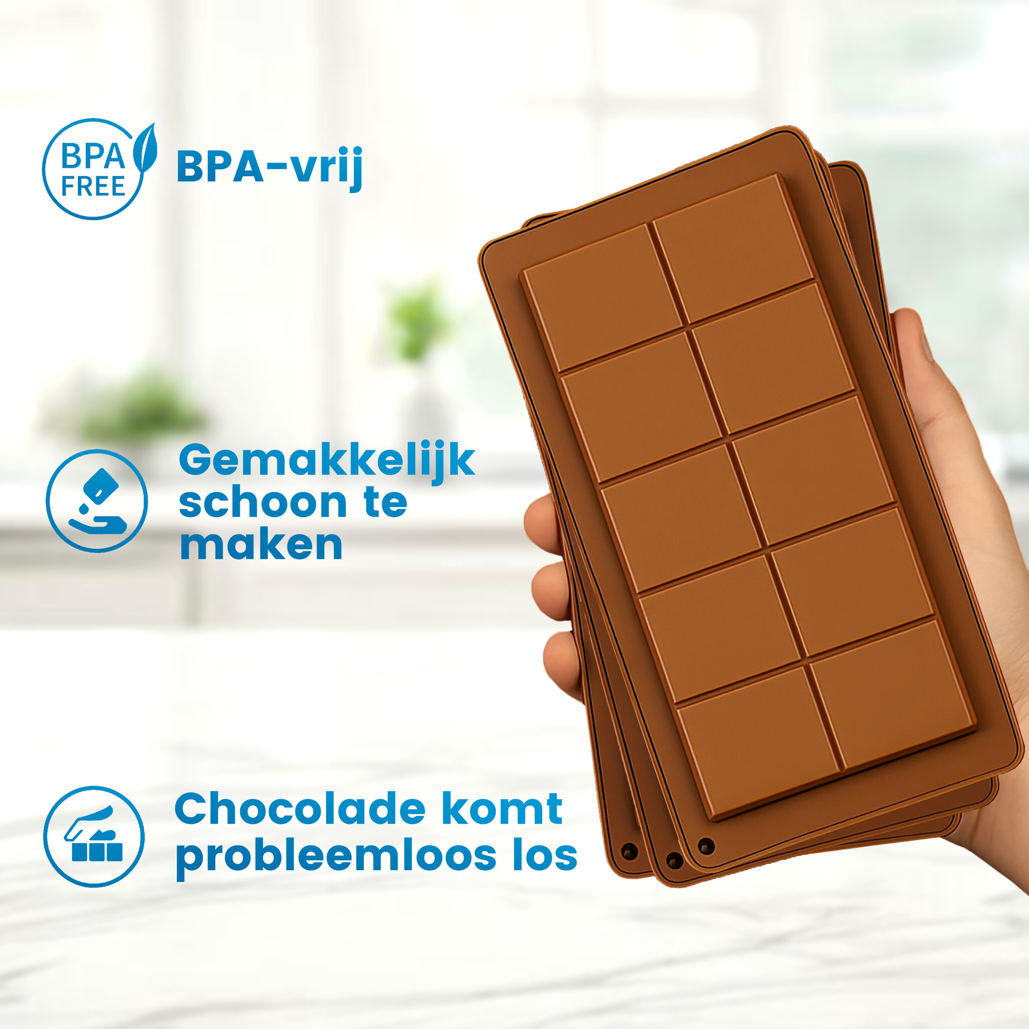De siliconen zijn herbruikbaar en eenvoudig schoon te maken, zowel met de hand als in de vaatwasser. De set bestaat uit drie identieke vormen, zodat je meerdere repen tegelijk kunt maken. Handig voor traktaties, feestjes of als voorraad voor de chocoladefan.