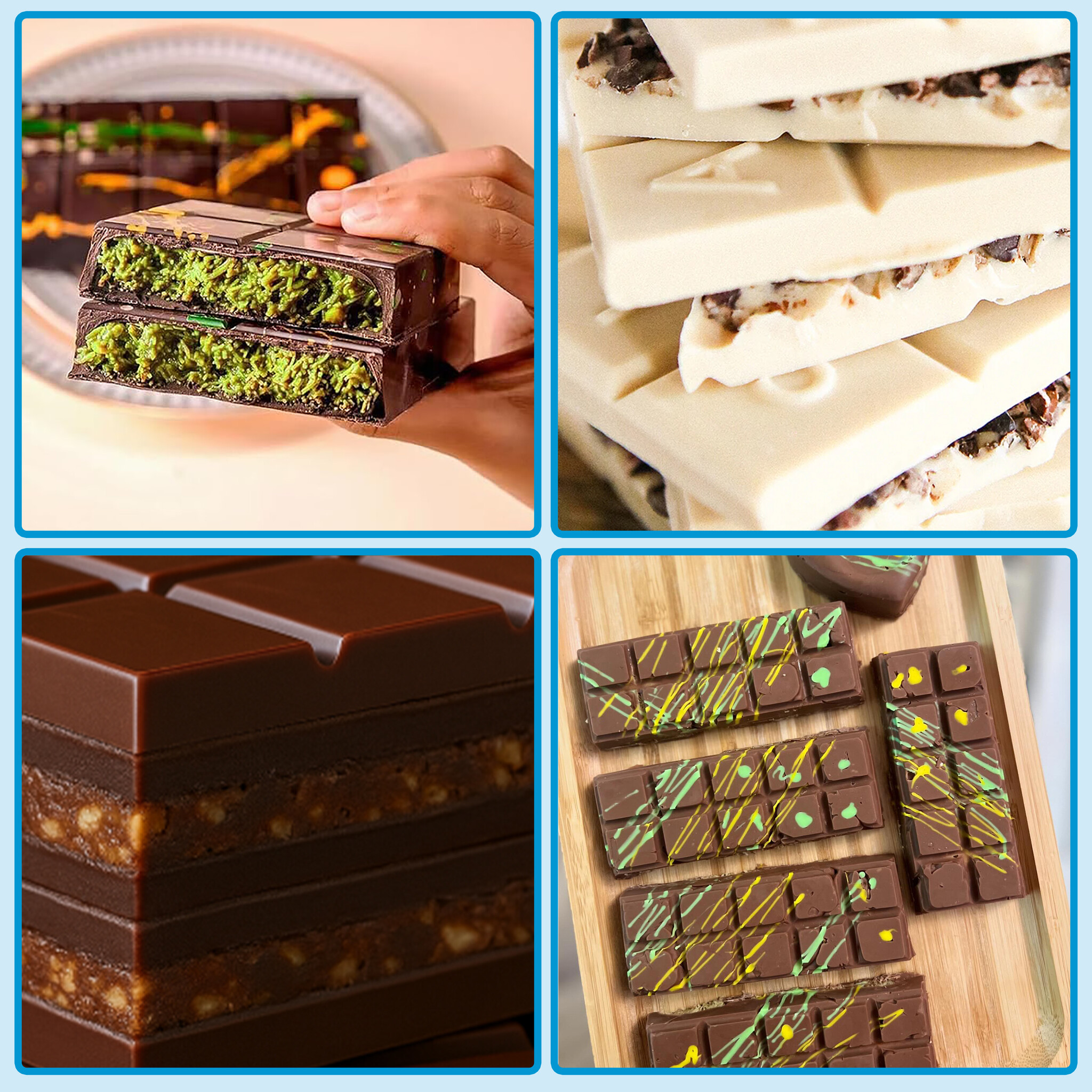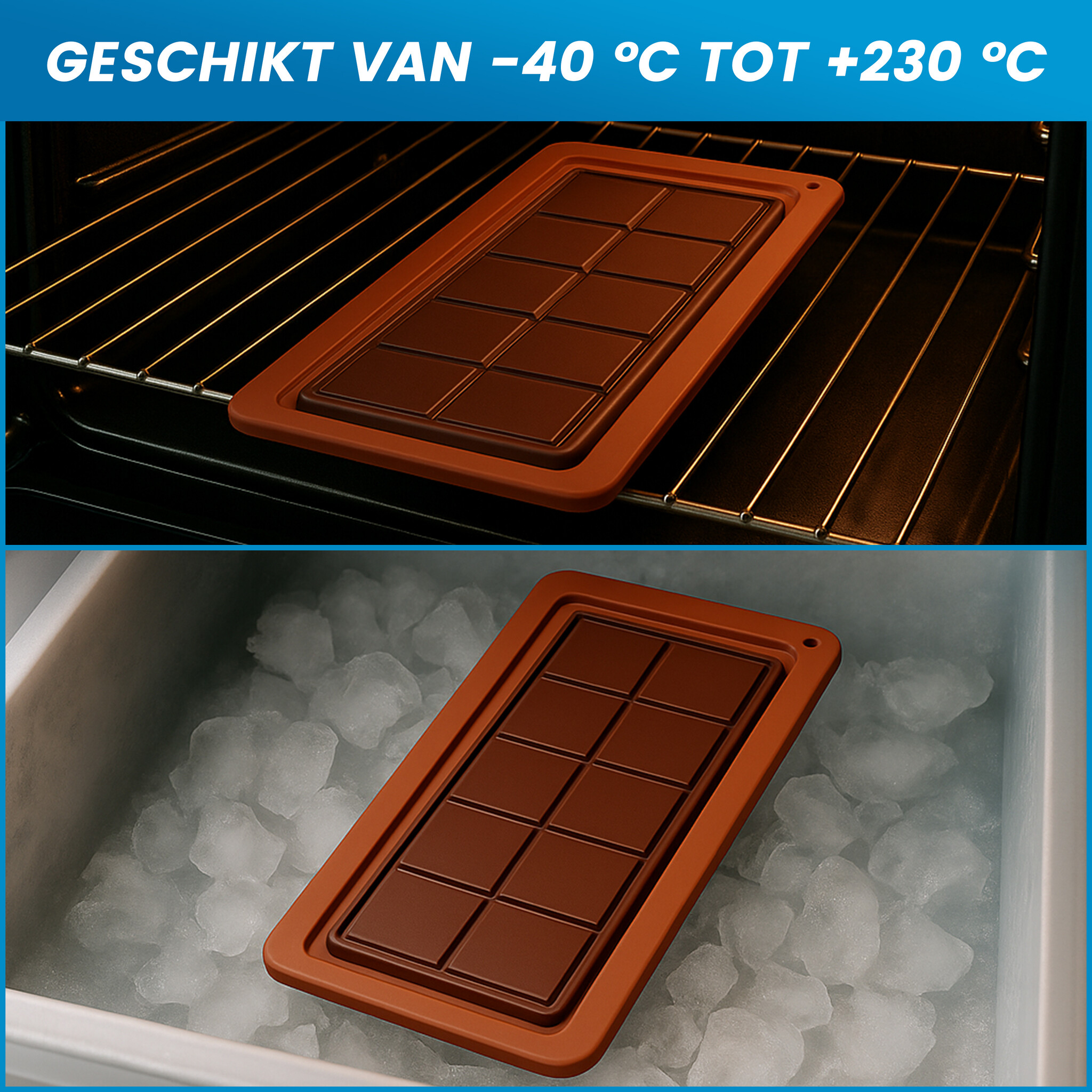 De vormen zijn gemaakt van hoogwaardig BPA-vrij siliconen en zijn extreem flexibel, waardoor je chocolade na het uitharden moeiteloos uit de vorm komt. Geschikt voor temperaturen van -40°C tot +230°C, dus je kunt ze zowel in de vriezer als in de oven gebruiken. Ook ideaal voor het maken van repen met noten of verschillende toppings.
