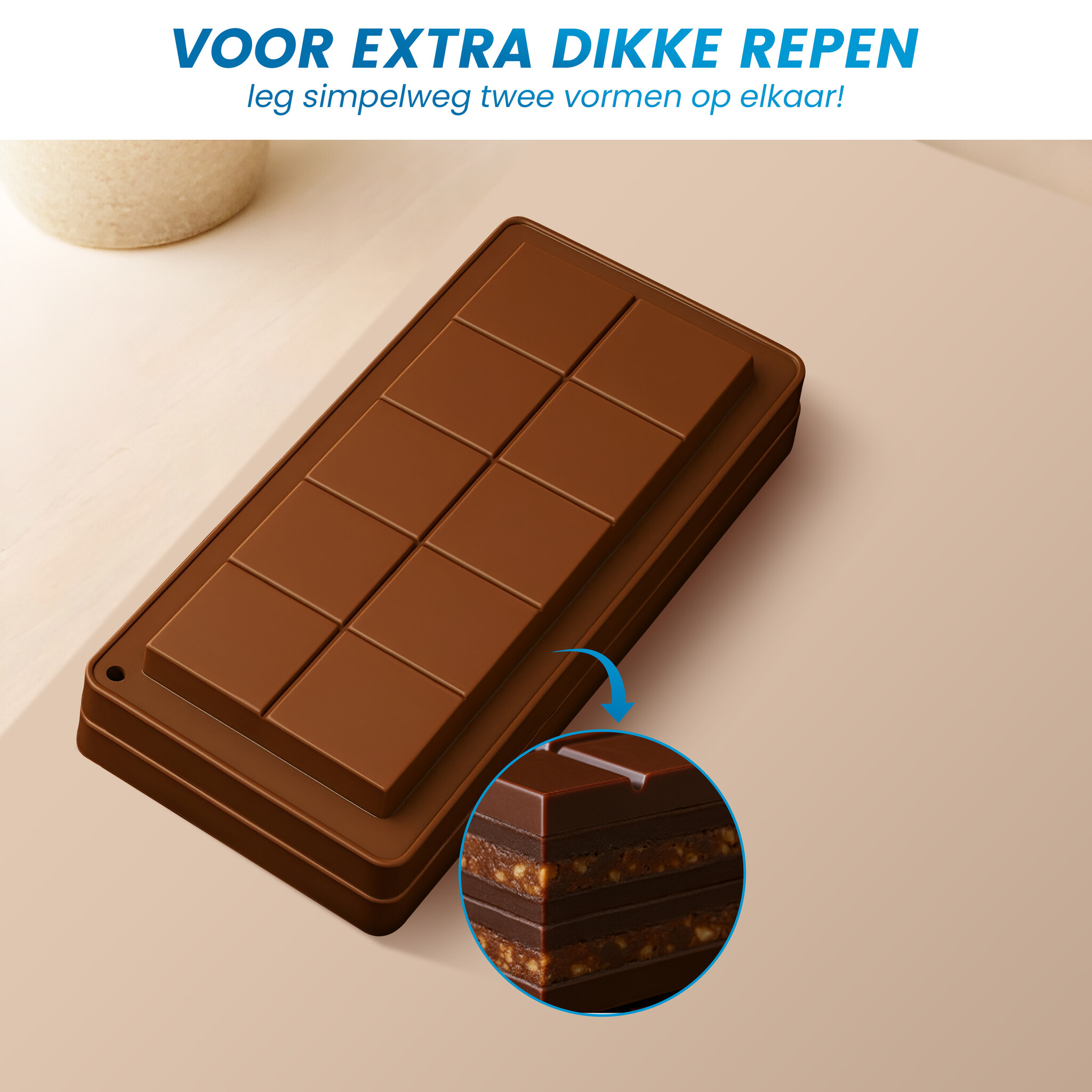 Wil je een dikke reep maken? Laat je chocolade even afkoelen en plaats twee vormen op elkaar. Zo creëer je eenvoudig een extra volle, stevige reep met een professioneel uiterlijk. Leuk om te geven of om er zelf van te genieten!