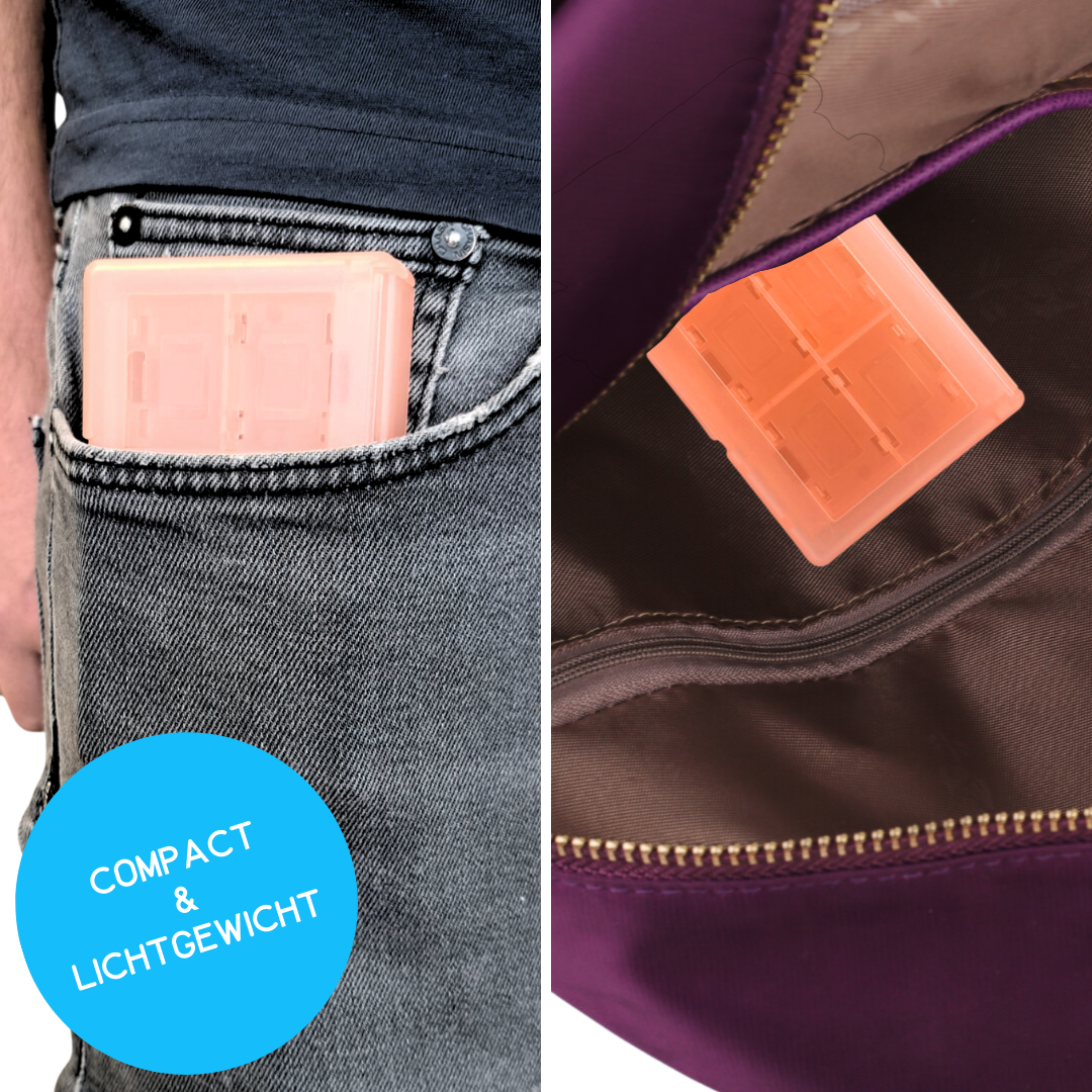 Deze game card case is gemaakt van stevig en hard materiaal dat de game cartridges op hun plaats houdt en beschermt tegen beschadiging. Het mechanisme van de case is zo ontworpen dat het de game cartridges op een stevige en veilige manier vasthoudt, zodat ze niet uit de case kunnen vallen of beschadigd kunnen raken tijdens transport. Dit zorgt ervoor dat je game cartridges veilig en georganiseerd blijven terwijl je onderweg bent en geeft je gemoedsrust dat je investering in je favoriete games veilig is.