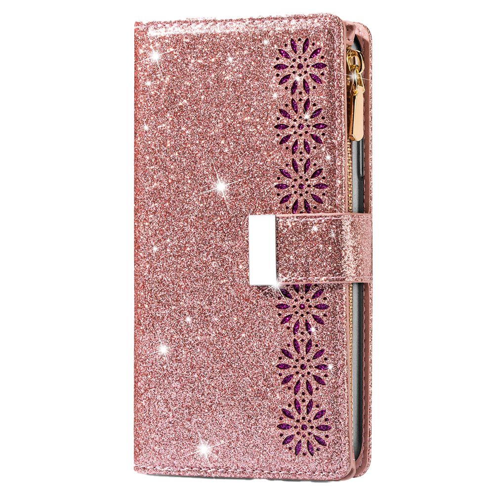 iPhone 16 hoesje - Bookcase - Koord - Pasjeshouder - Portemonnee - Glitter - Bloemenpatroon - Kunstleer - Rose Goud