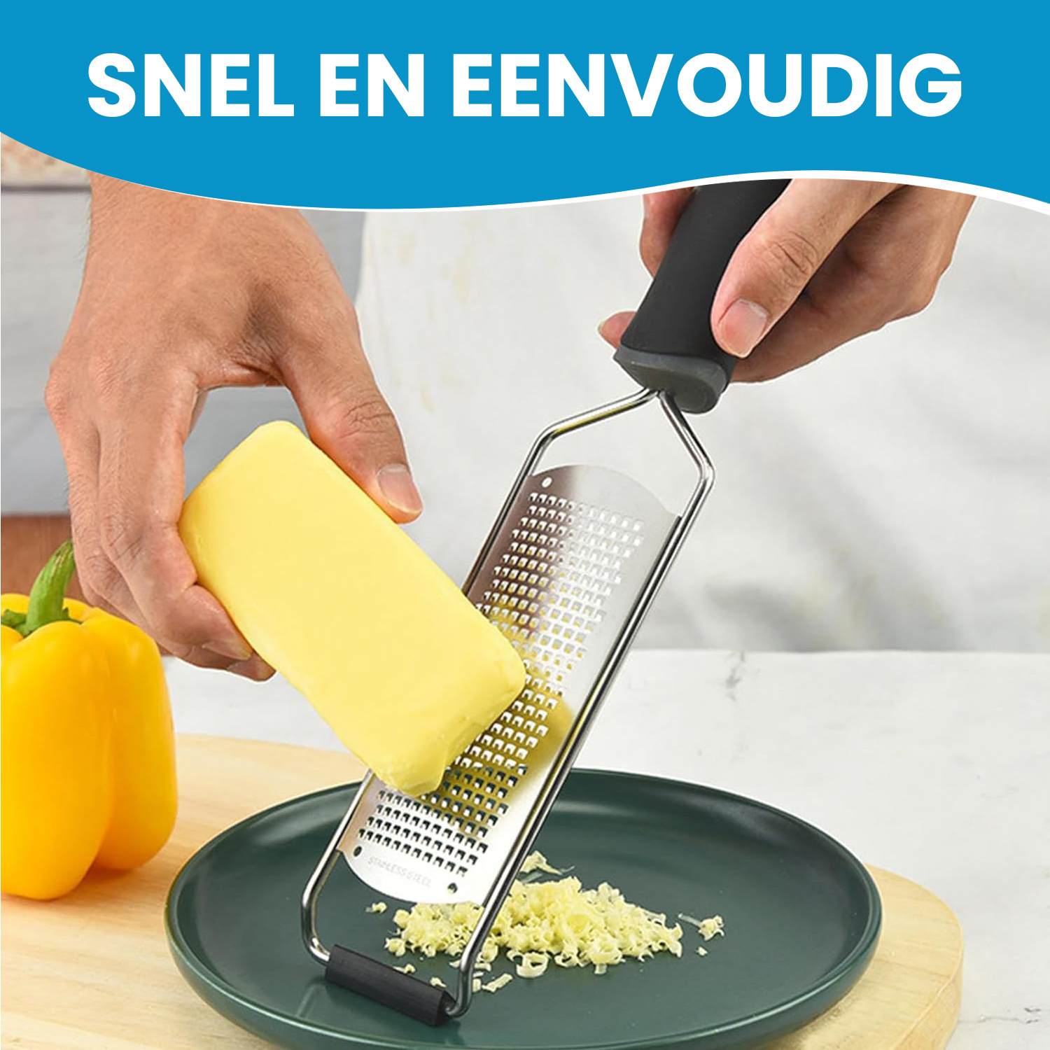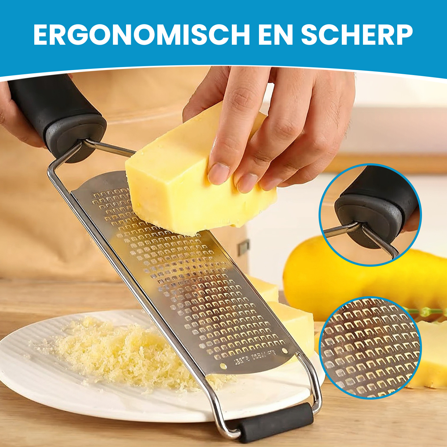 De ergonomische handgreep ligt prettig in de hand en vermindert vermoeidheid tijdens het raspen. Zo werk je comfortabel, zelfs bij grotere hoeveelheden.