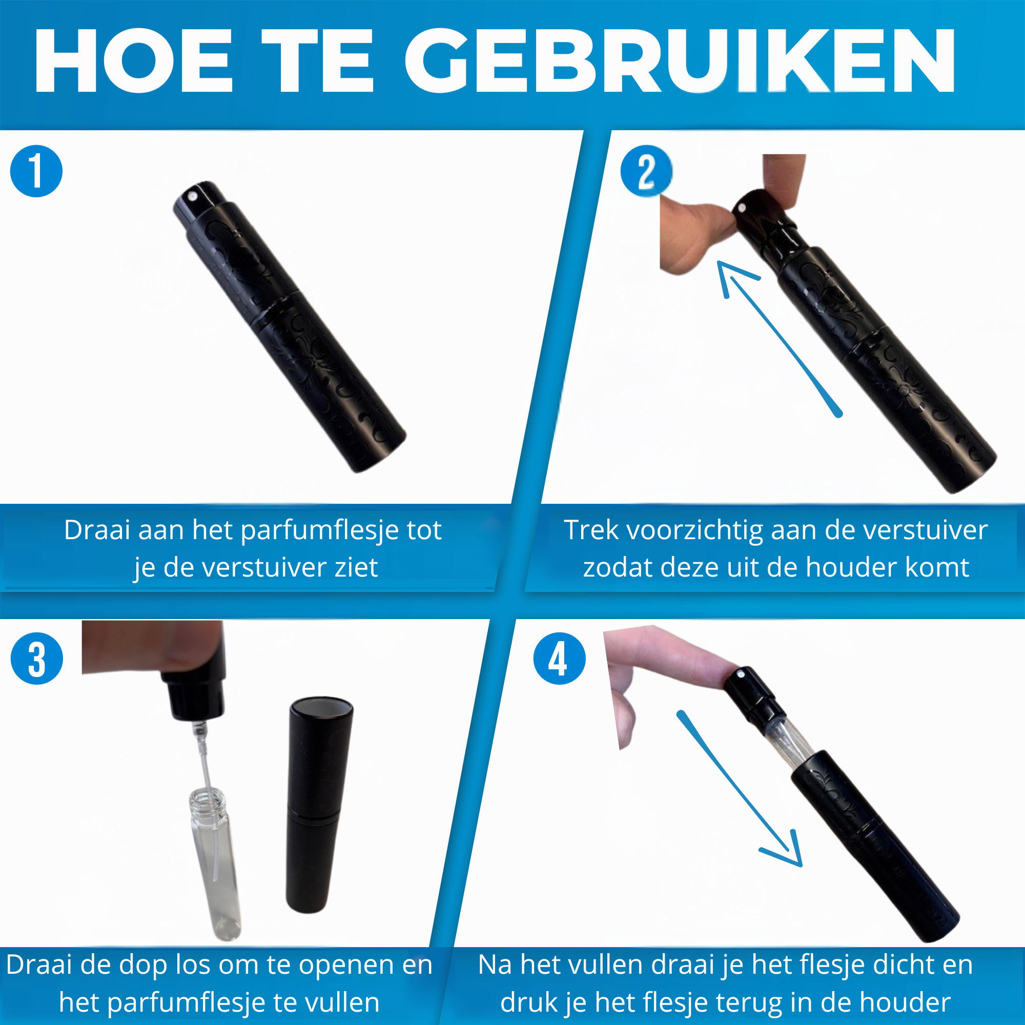 De parfumverstuiver is door de handige vulopening makkelijk bij te vullen, zonder te morsen. Het flesje is volledig glasvrij, waardoor het vrijwel onbreekbaar is. De dop van het flesje is stevig en sluit goed af, zodat het parfum niet gaat lekken. Deze parfumverstuivers hebben een inhoud van 10 ml parfum inhoud, dat betekent dat jij tot wel 100x kan sprayen.
