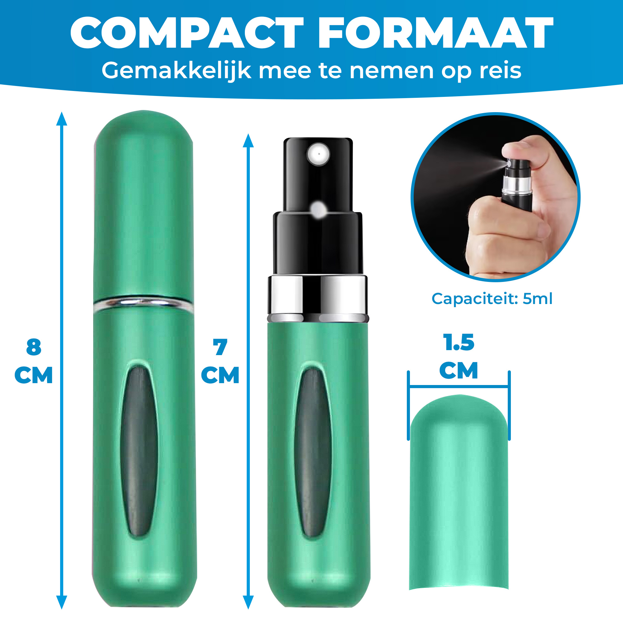 De parfumverstuiver is door de handige vulopening makkelijk bij te vullen, zonder te morsen. Het flesje is volledig glasvrij, waardoor het vrijwel onbreekbaar is. De dop van het flesje is stevig en sluit goed af, zodat het parfum niet gaat lekken. Deze parfumverstuivers hebben een inhoud van 5 ml parfum inhoud, dat betekent dat jij tot wel 50x kan sprayen.