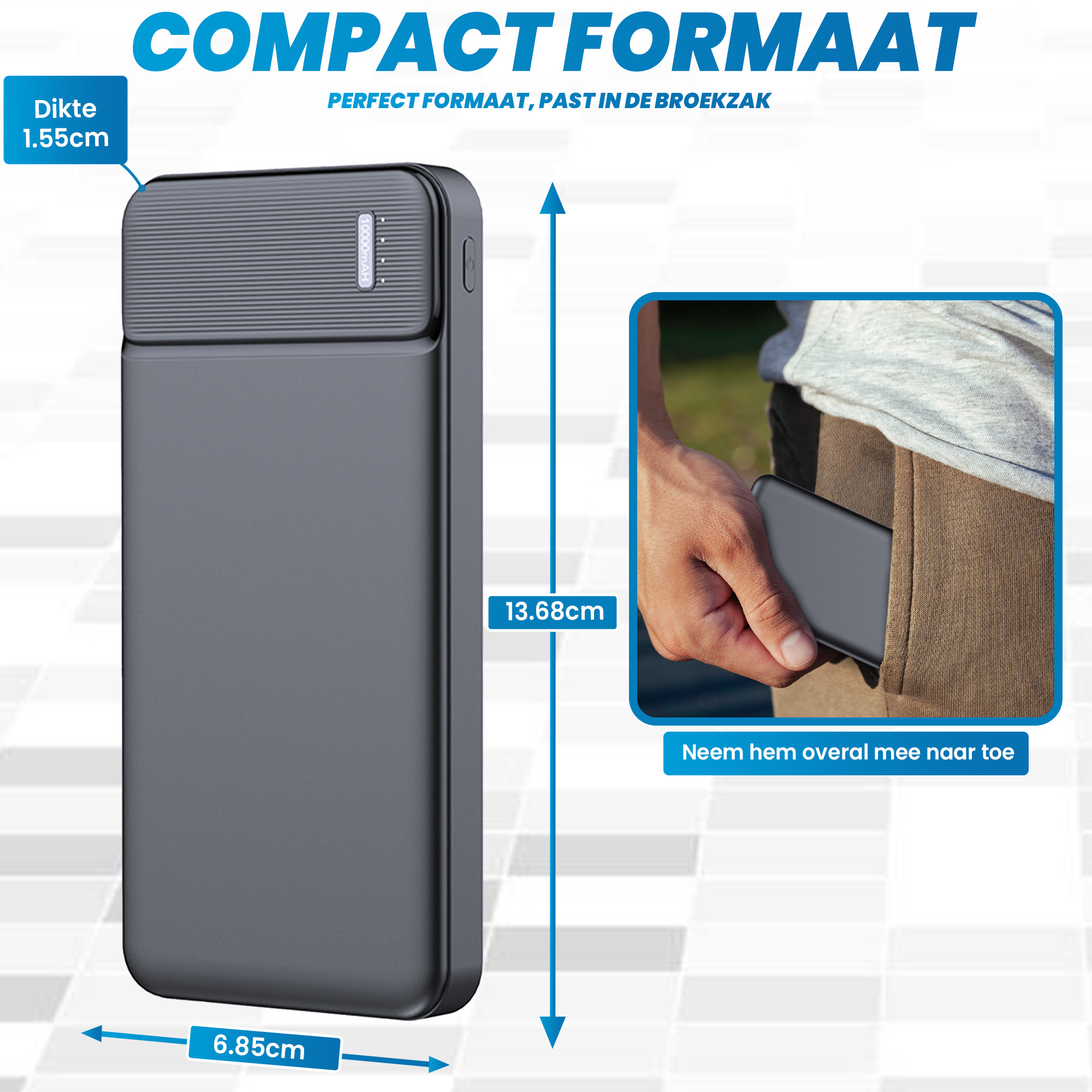 Ondanks de ruime capaciteit van de powerbank is het design heel compact. Het formaat van de powerbank is 13,6 cm x 6,85 cm x 1,55 cm zodat deze altijd in iedere broekzak past. Daarnaast is de powerbank met een gewicht van maar 280 gram extreem licht. Zo heb je de powerbank altijd direct bij de hand, ideaal!