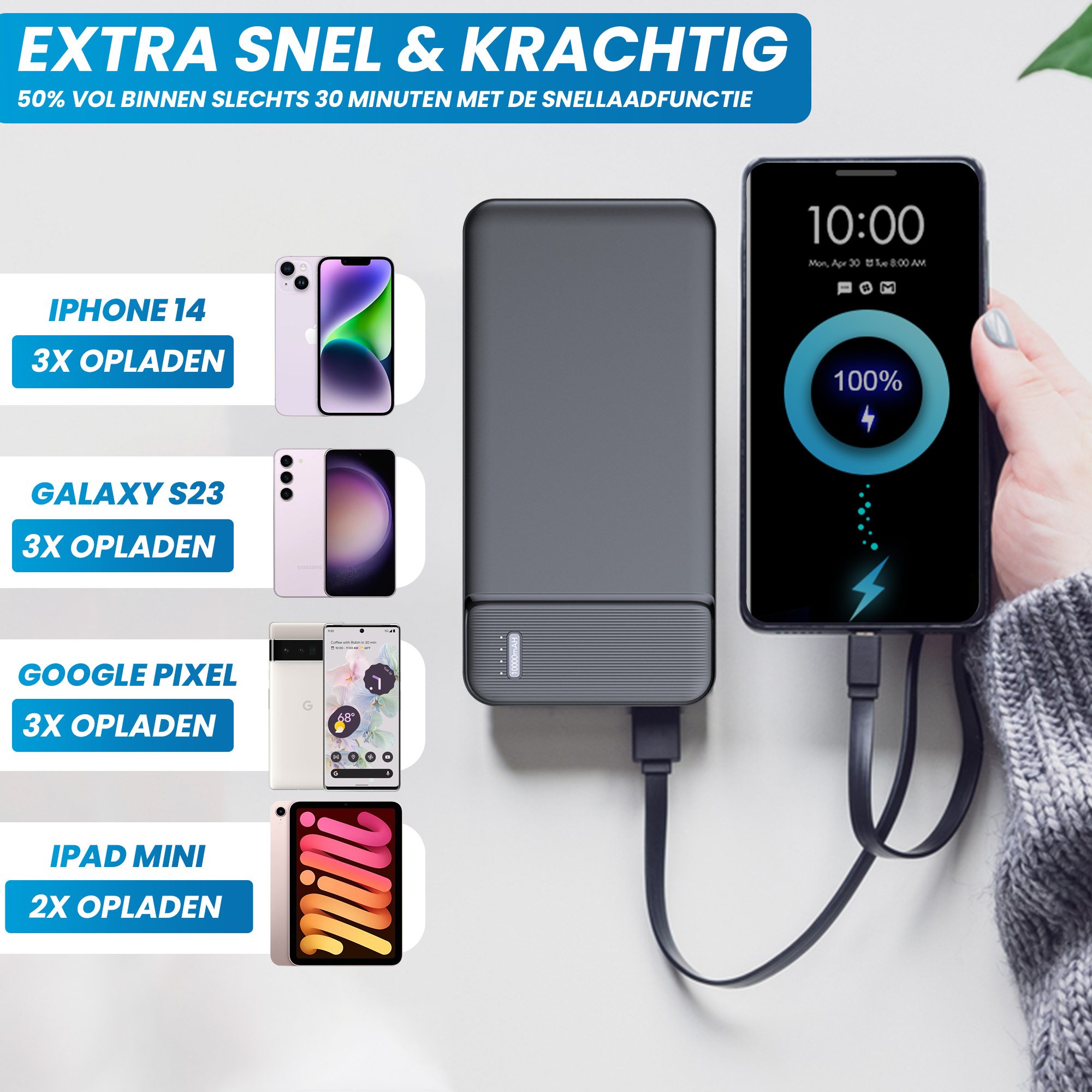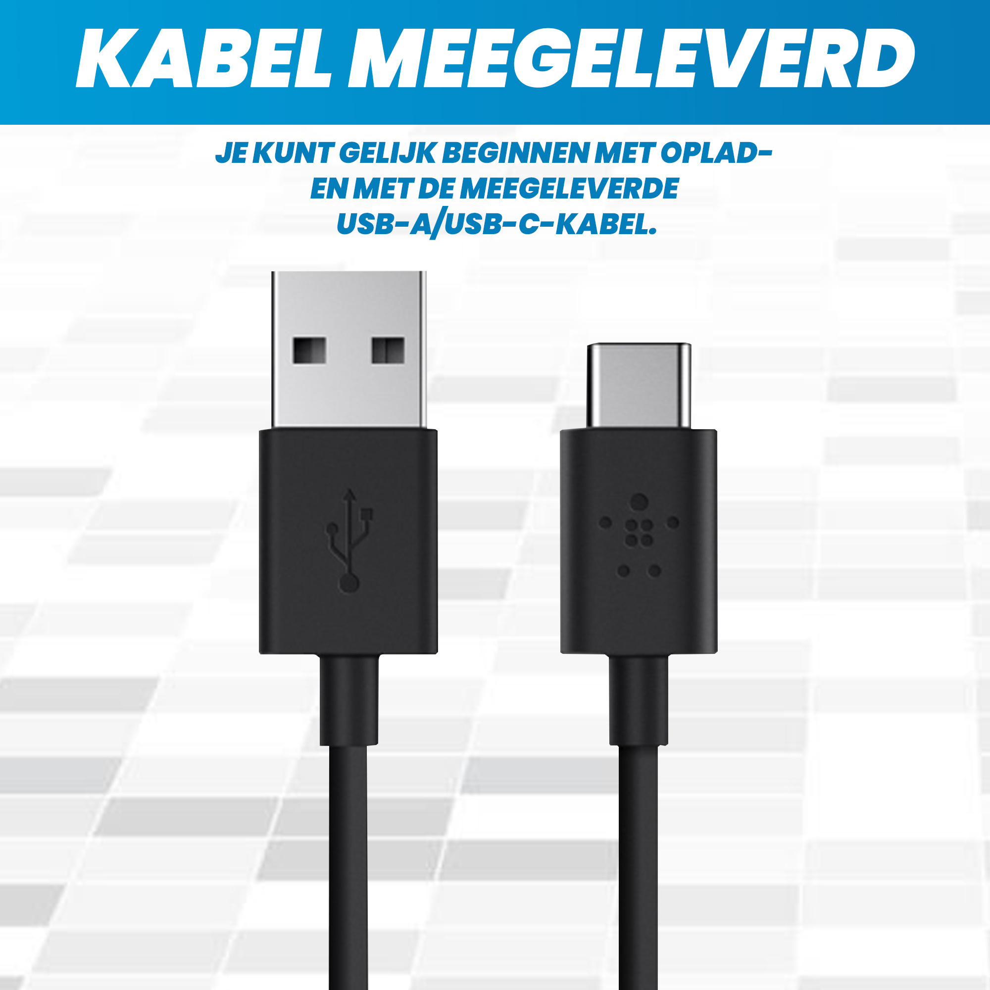 - Extra USB-A naar USB-C kabel meegeleverd. Hiermee kan je zowel de powerbank als USB-C apparaten opladen