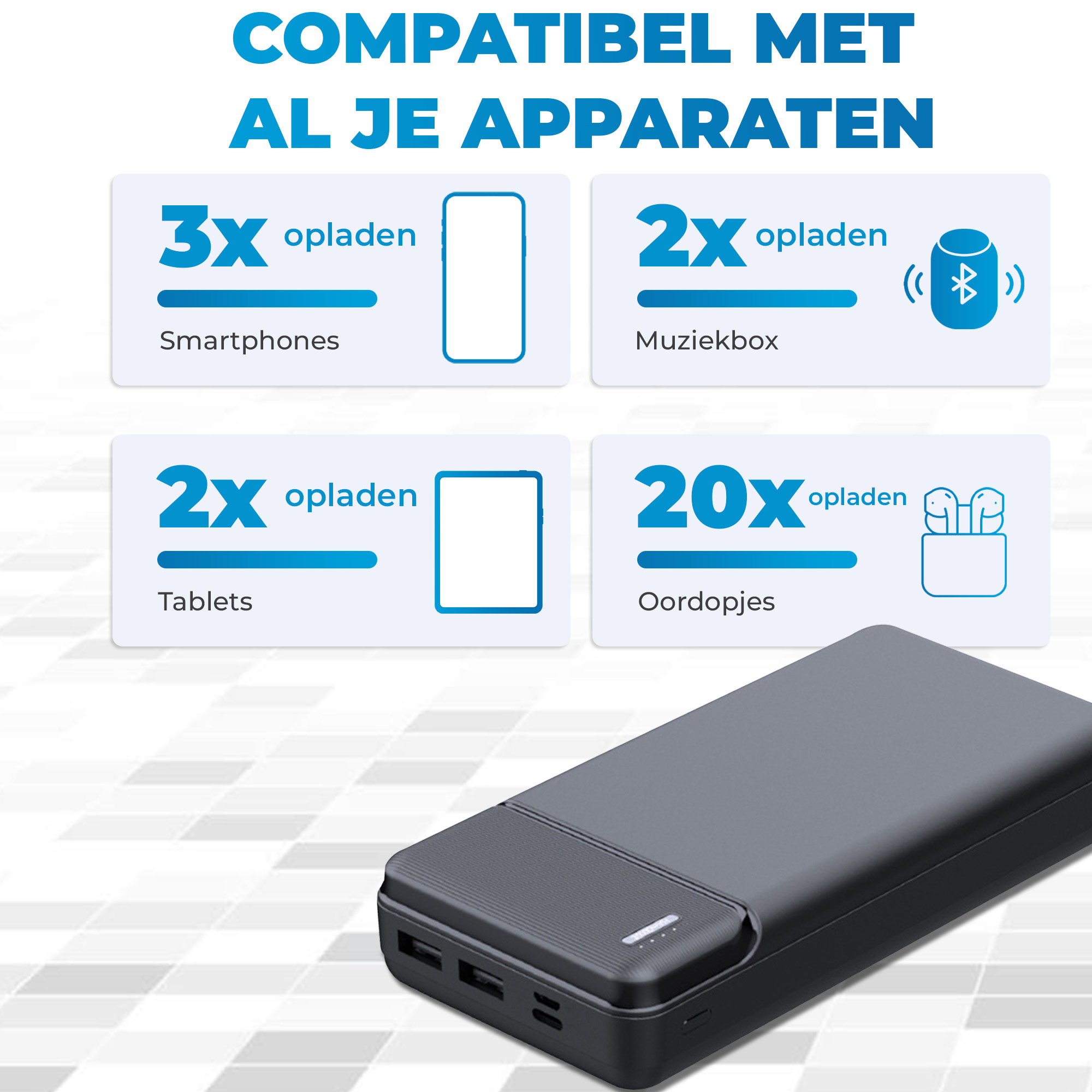 Ga je op reis? Met een capaciteit van 20.000 mAh voldoet deze powerbank aan de regels voor handbagage en mag hij veilig mee in het vliegtuig (maximaal 27.000 mAh toegestaan).