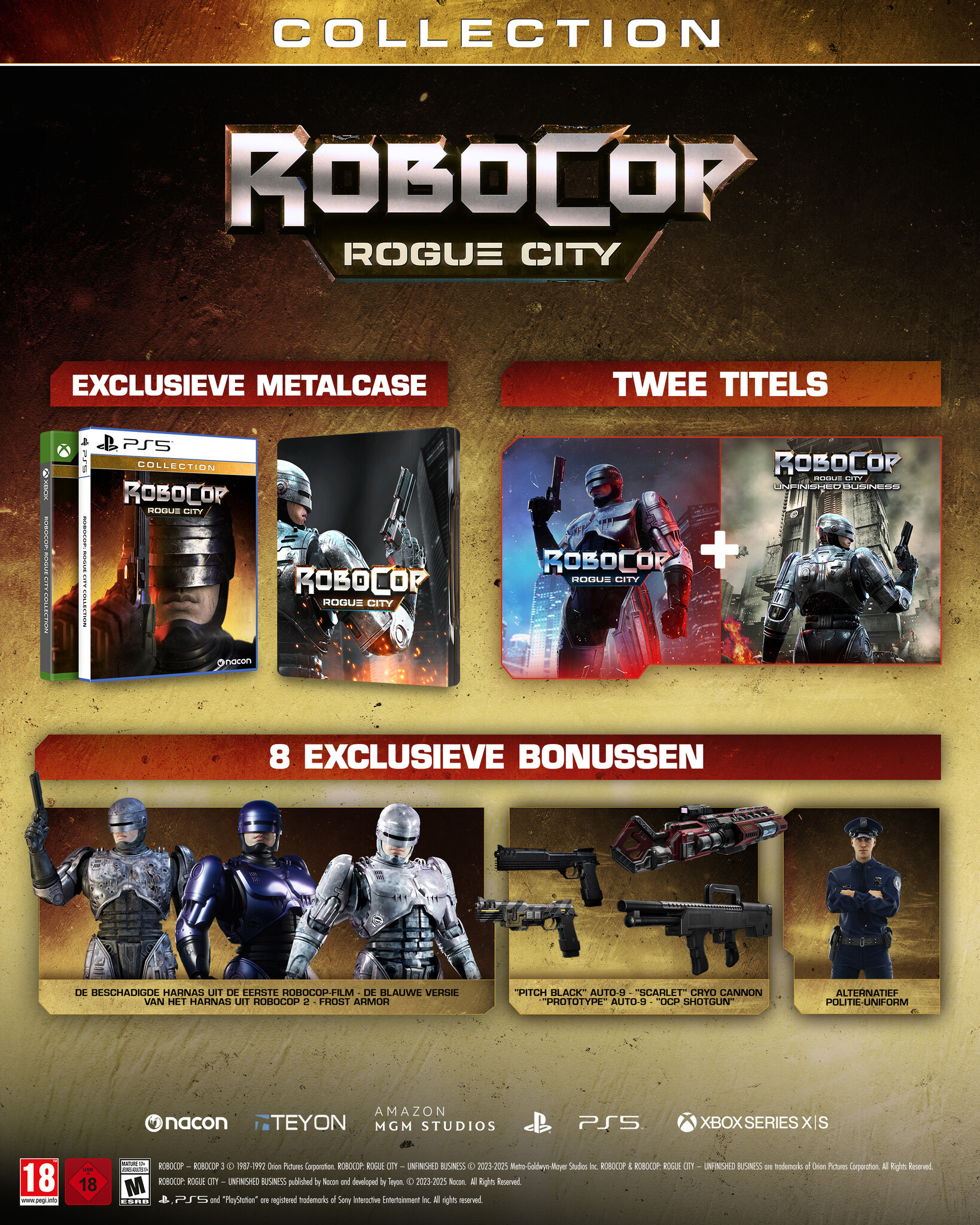 Deze Collector’s Edition bundelt de fysieke Deluxe Editions van RoboCop: Rogue City en Unfinished Business, met 8 exclusieve in-game bonussen.