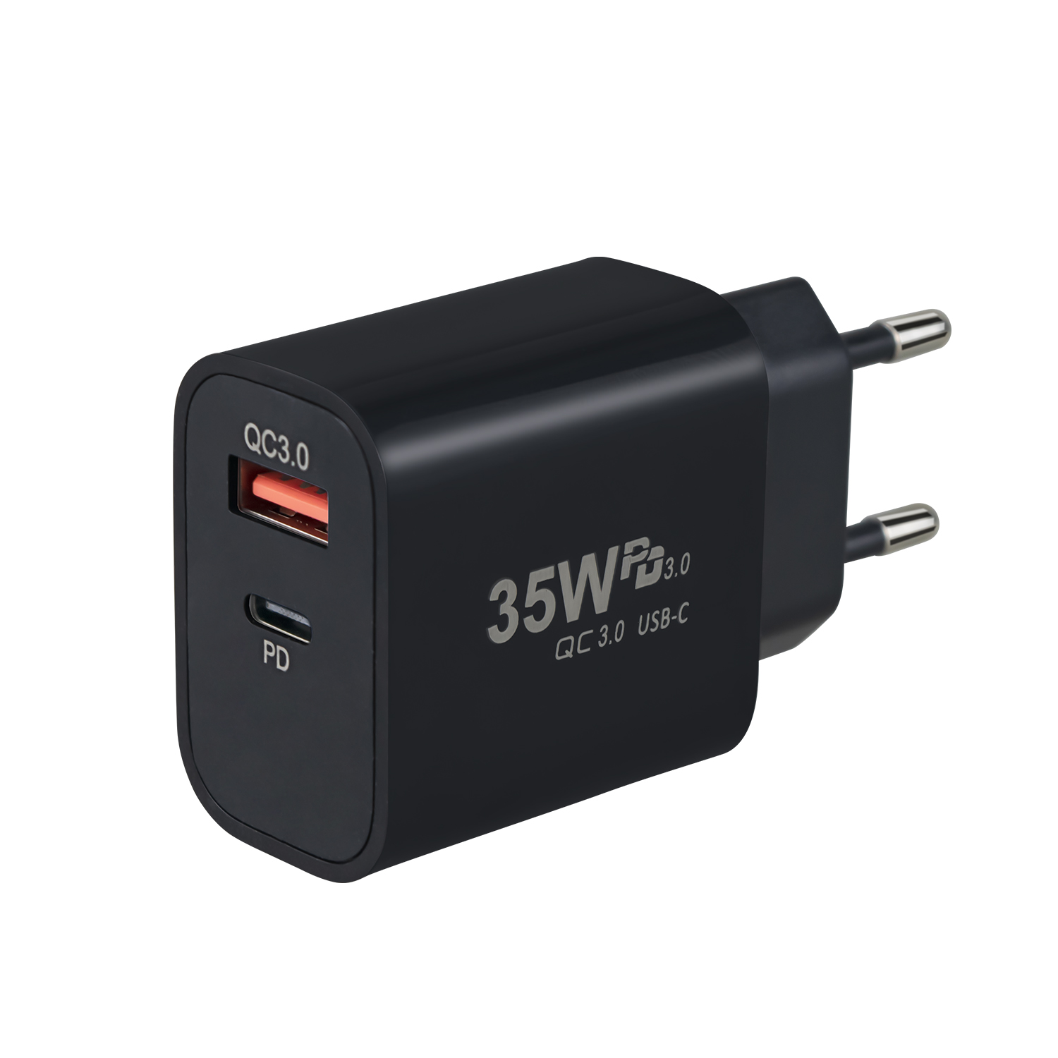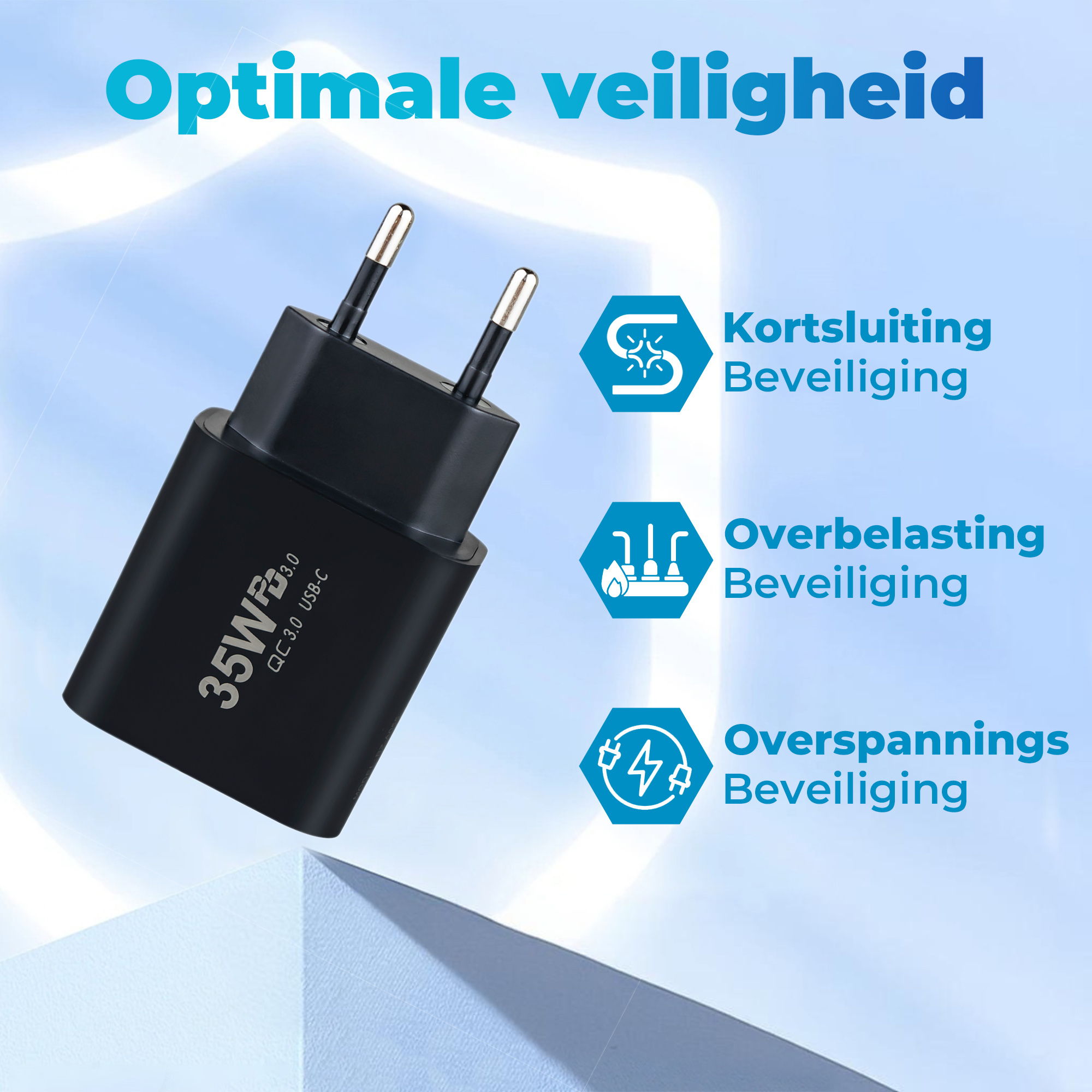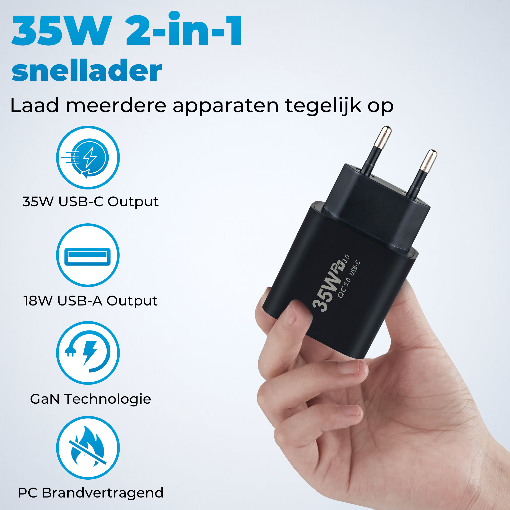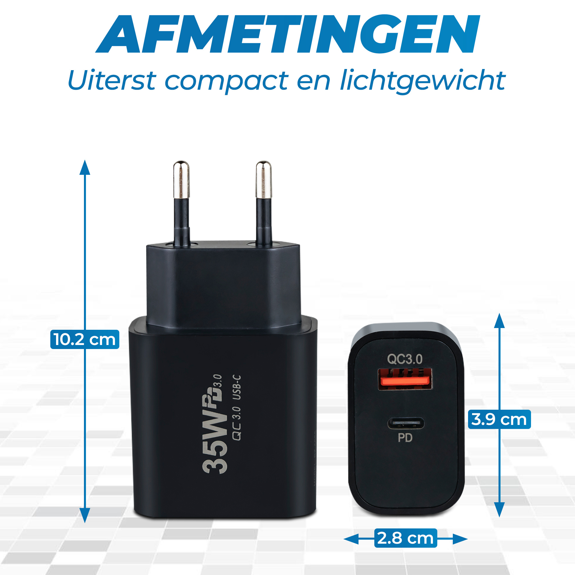 Snellader 35W - 1x USB-C PD Fast Charge - 1x USB-A Quick Charge 3.0 – Oplader 35 Watt - GaN Technologie - USB-C Adapter - Geschikt voor Smartphones, Tablets, Etc. - Zwart