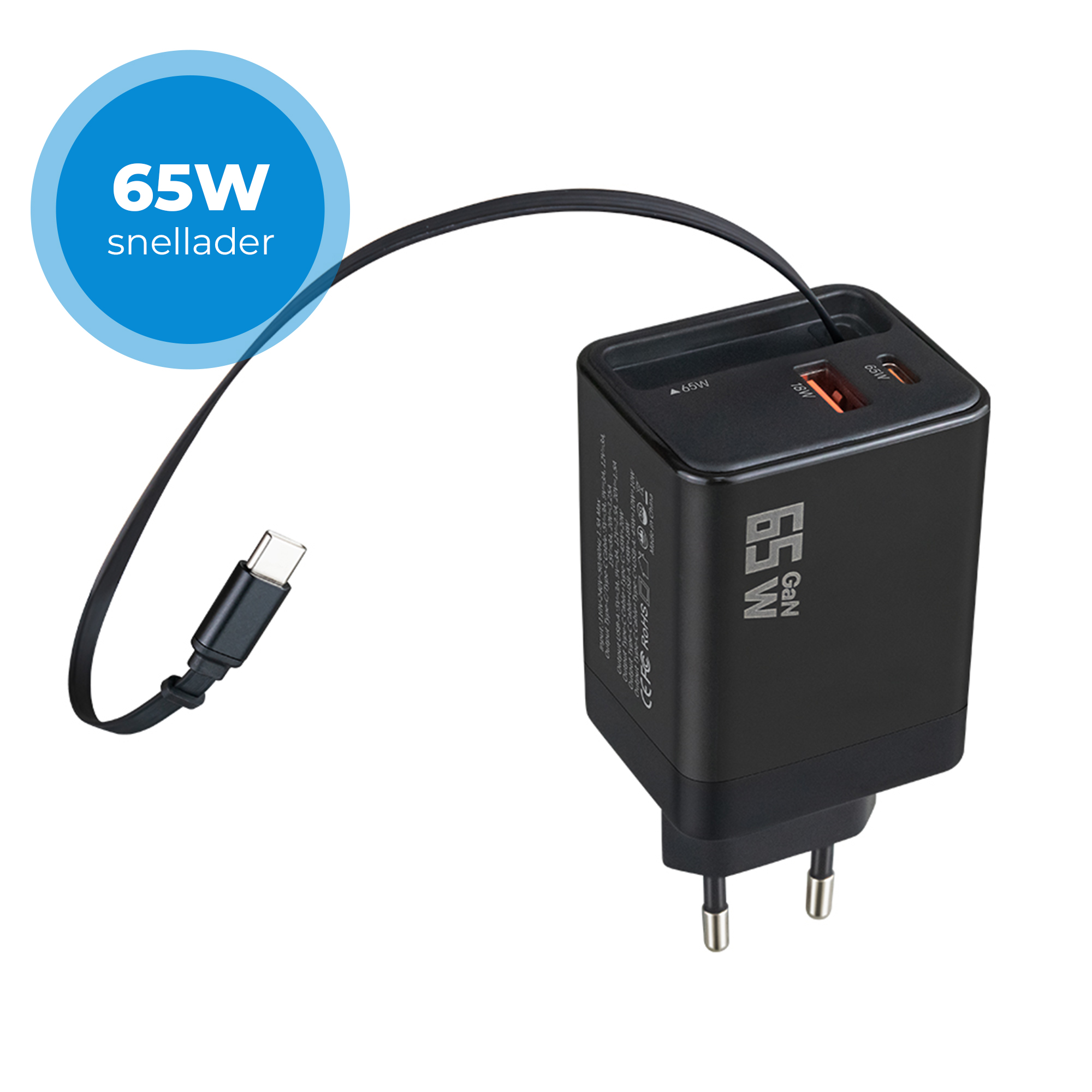 Laad je apparaten razendsnel én veilig op met de JVS Products Snellader 65 Watt met geïntegreerde kabel!
