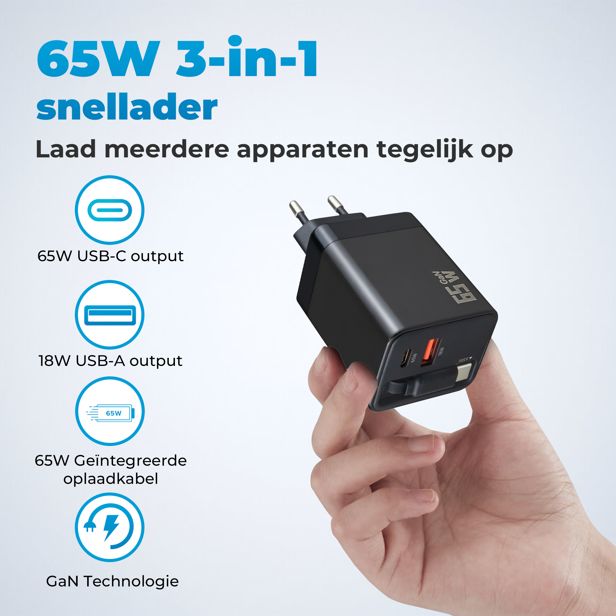 Met één USB-C poort, één USB-A én een ingebouwde USB-C kabel laad je drie apparaten tegelijk op. De USB-C poort levert tot 65 Watt, krachtig genoeg voor laptops en andere high-power apparaten. De USB-A poort ondersteunt Quick Charge 3.0 met 18 Watt is perfect voor het snel opladen van compatibele smartphones en gadgets.