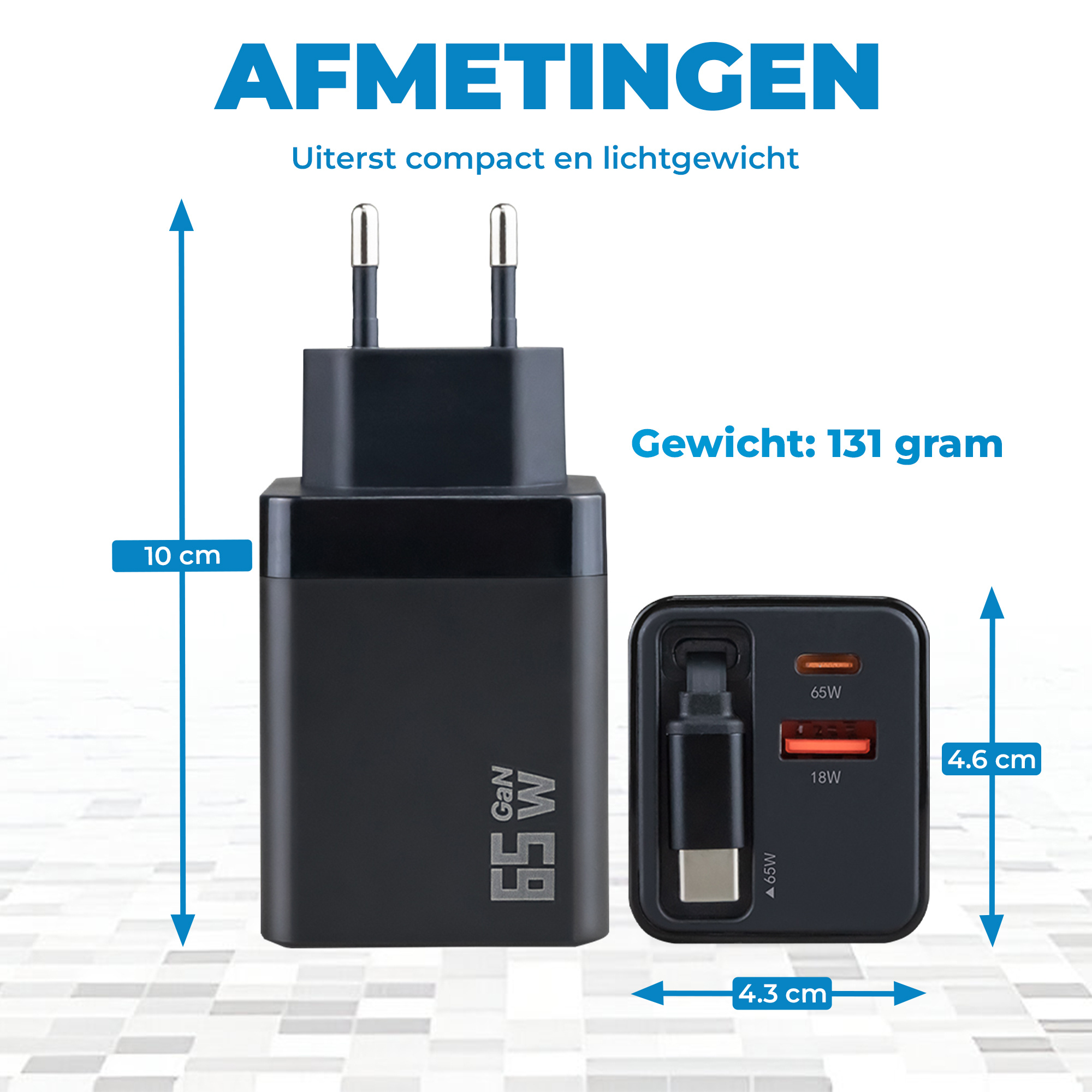 Snellader 65W - Inclusief 65W geïntegreerde USB-C Kabel - 1x USB-C PD Fast Charge - 1x USB-A Quick Charge 3.0 - Oplader 65 Watt - Met kabel - GaN Technologie - USB-C Adapter - Zwart