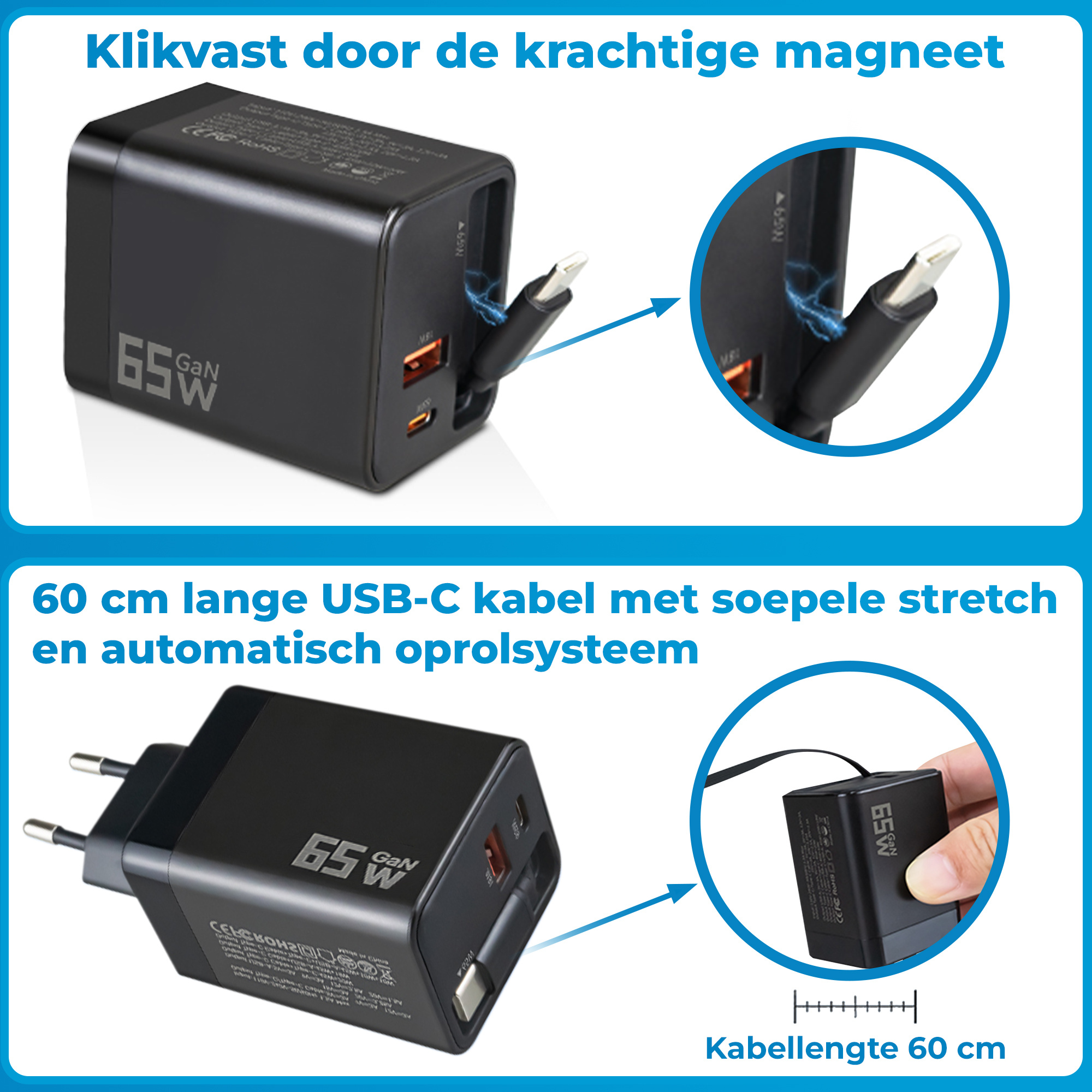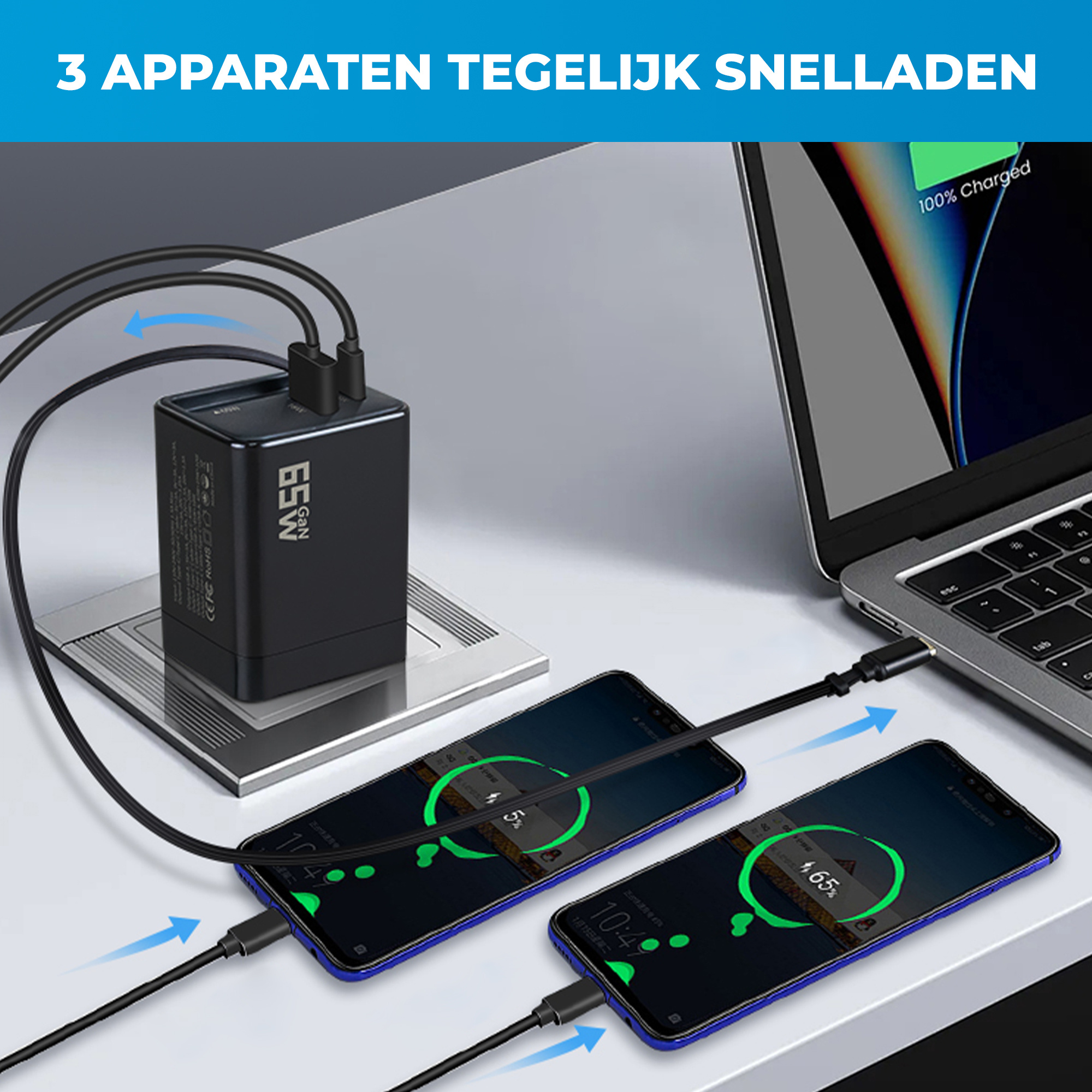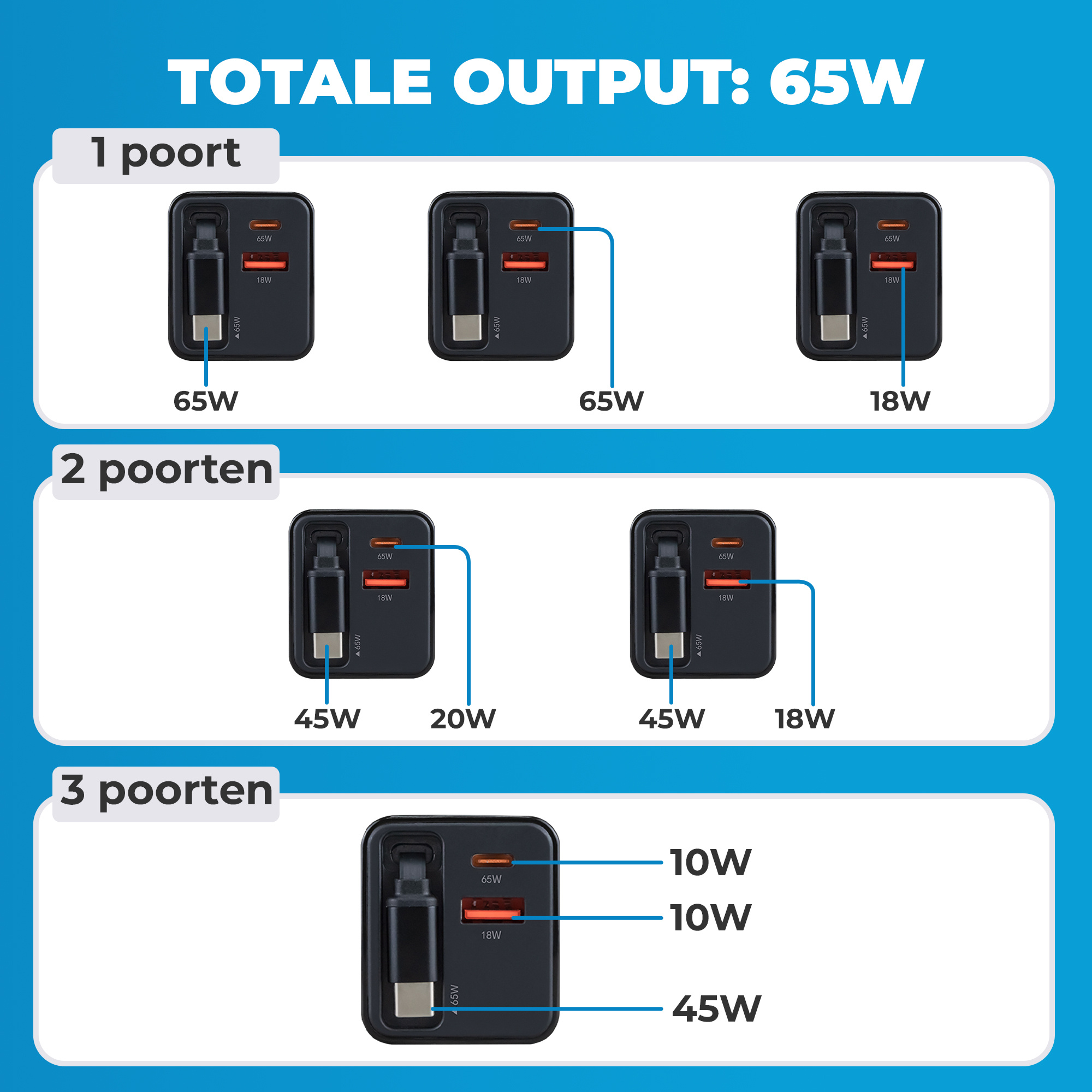 - USB-C PD 65W: Snel opladen van laptops, tablets en telefoons