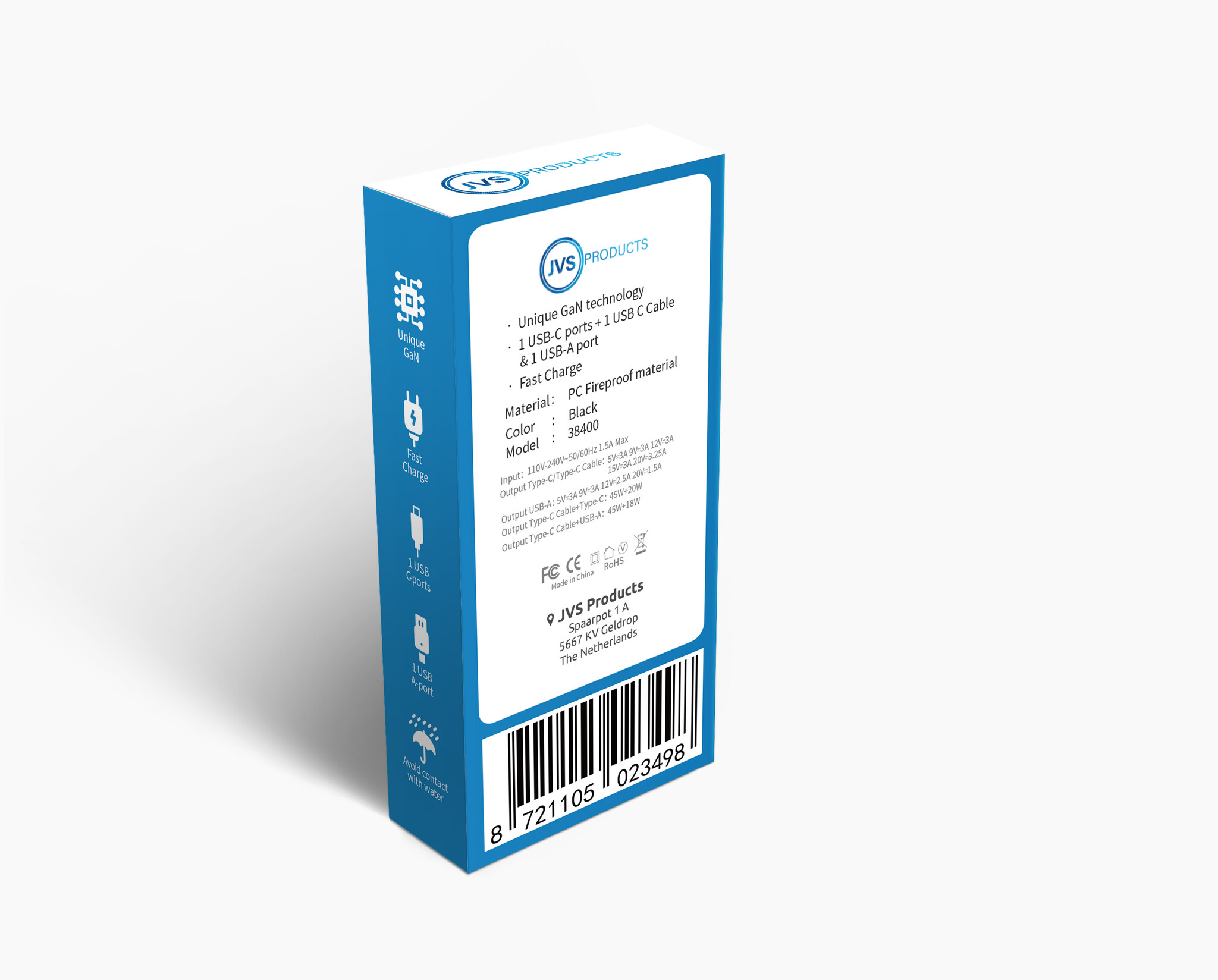 De JVS Products Snellader maakt gebruik van moderne GaN-technologie voor snellere en efficiëntere laadtijden. Ondersteuning voor zowel PD Fast Charge als Quick Charge 3.0 betekent dat je jouw apparaten in recordtijd kunt opladen. Ideaal voor thuis, op kantoor of onderweg.