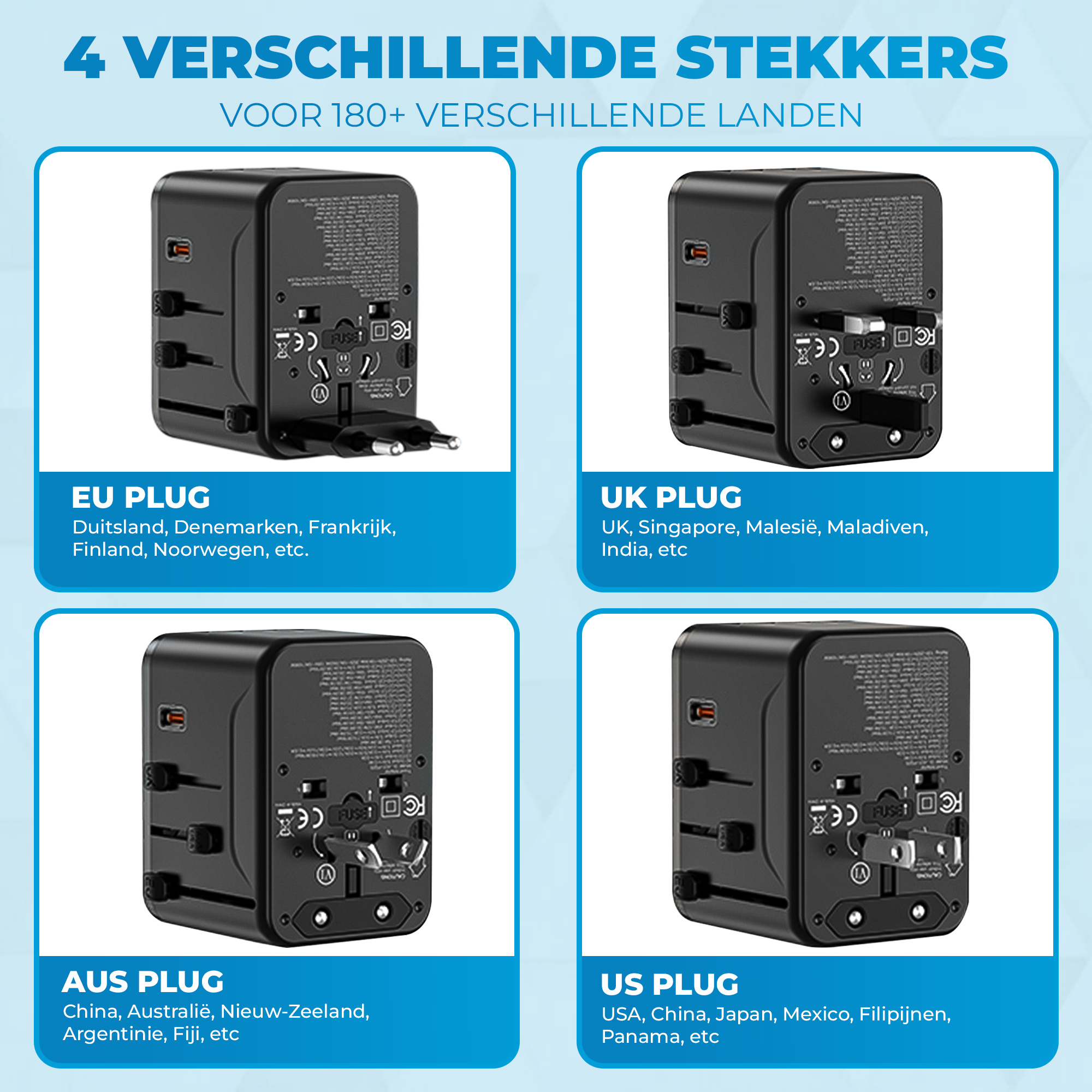 Universele wereldstekker - Snellader 18W - Reisstekker - Internationale Reisadapter - 2x USB-C en 2x USB-A - 180+ Landen - Amerika (USA) - Zuid Amerika - Engeland (UK) - Azië - Europa - Afrika - 2500W - Wereldstekker lichtgewicht - Zwart