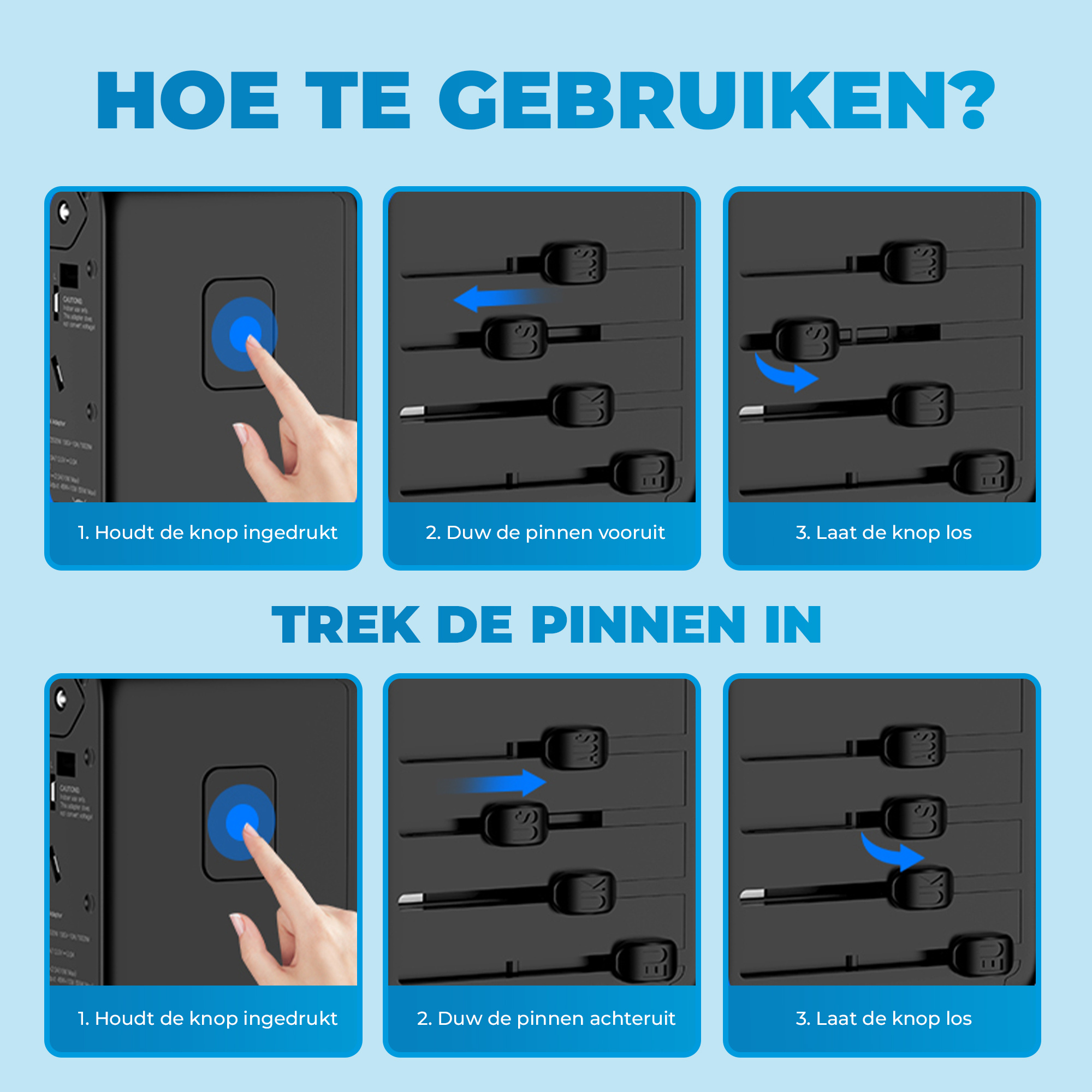 Geen gedoe meer met het vinden van de juiste stekker in onbekende stopcontacten. Onze JVS Products wereldstekker is ontworpen voor ultiem gemak. Met een eenvoudige schuif- en draaihandeling stel je moeiteloos de juiste stekker in voor jouw bestemming. Zo simpel is het!