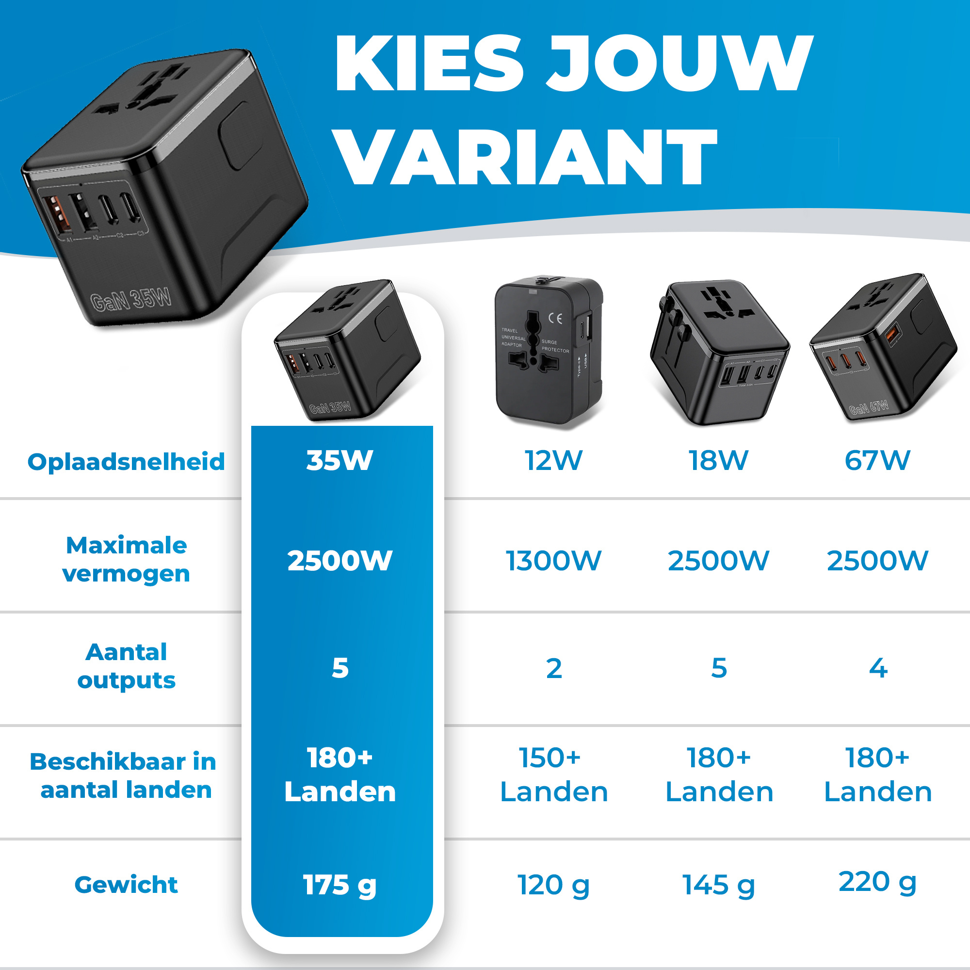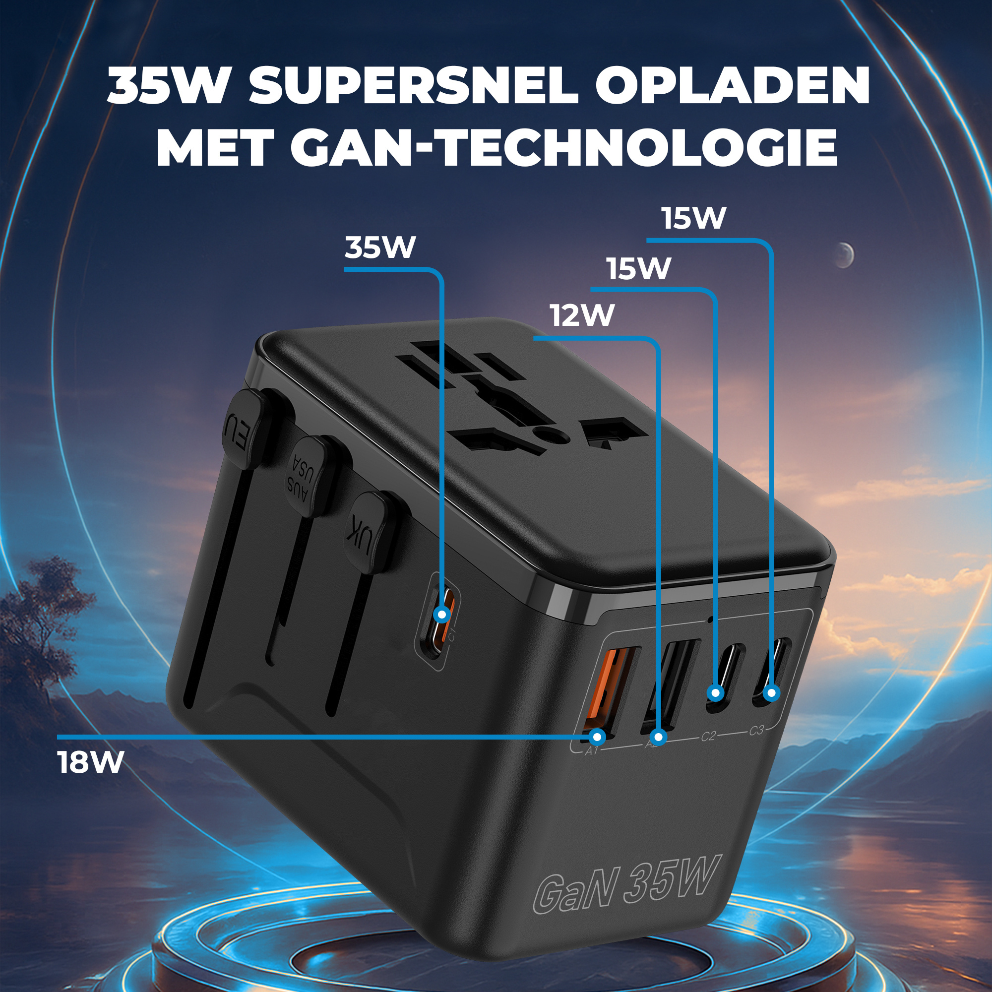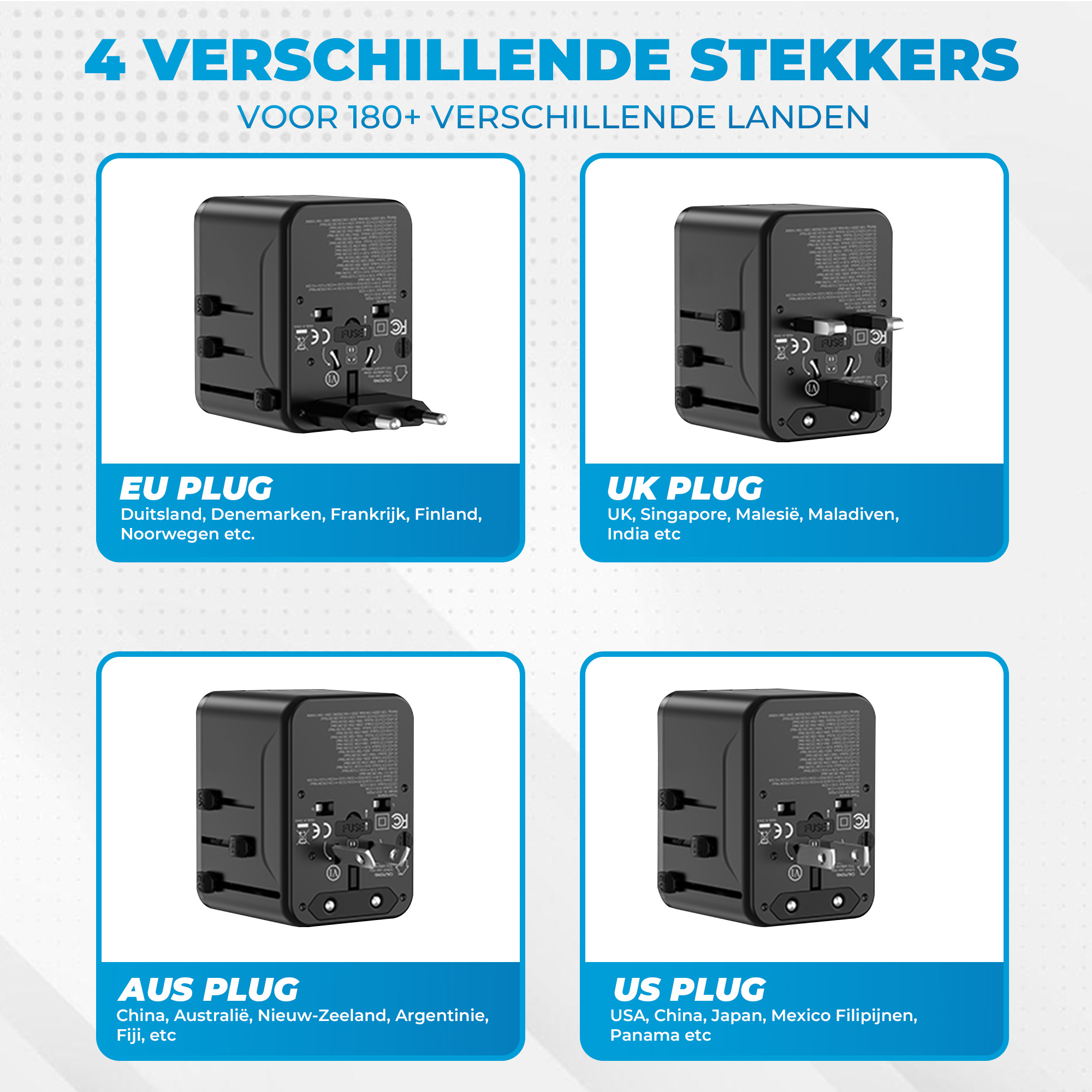 Universele wereldstekker - Snellader 35W - Reisstekker - Internationale Reisadapter - 2x USB-C en 2x USB-A - 180+ Landen - Amerika (USA) - Zuid Amerika - Engeland (UK) - Azië - Europa - Afrika - 2500W - Wereldstekker lichtgewicht - Zwart