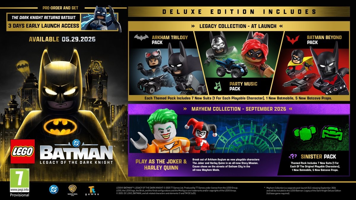 *Mayhem Collection is een aparte DLC die na de lancering in september 2026 wordt uitgebracht en wordt meegeleverd met LEGO Batman: Legacy of the Dark Knight Deluxe Edition (volledige basisgame vereist).